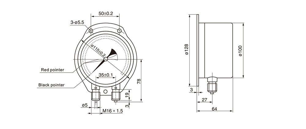 儀表由兩套各自獨立的測量系統(tǒng)和指示裝置組成。被測壓力作用于兩測壓元件(彈簧管)后致使管端各自產(chǎn) 生相應(yīng)的位移,經(jīng)傳動機構(gòu)放大后,由固定在齒輪軸上的紅、黑指針逐將兩個被測壓力值分別在度盤上指示出 來。