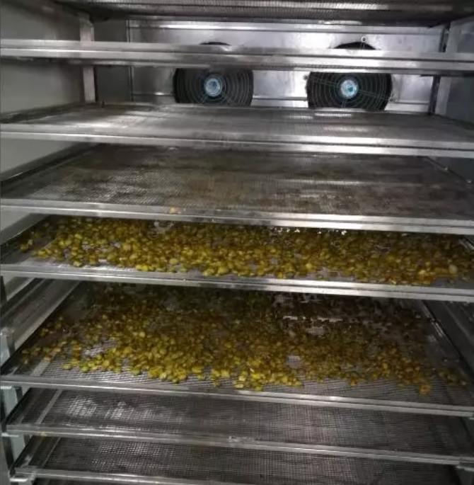 按照6P烘干除濕一體主機配置5.5米長3米寬2.2米高10公分聚氨酯保溫烘干房,安裝8臺循環(huán)軸流風(fēng)機,一次放入6臺物料車,每車12層,每層裝入新鮮欖錢20斤,每車裝入200-240斤,一批次共裝入1200-1500斤,欖錢烘干溫度可以定的比較高,控制在70度,6P主機的每小時除濕量是25升水,約50斤,欖錢的脫水在6:1左右,按照一次放入1200斤新鮮欖錢計算,需要脫水1000斤,需要20小時,如果在烘干房對面增加一臺25升的純除濕機,可以縮短時間5-7小時,這樣效率就比較高,但是初始投入會增加,這個可以根據(jù)客戶自身的需求進行配置。