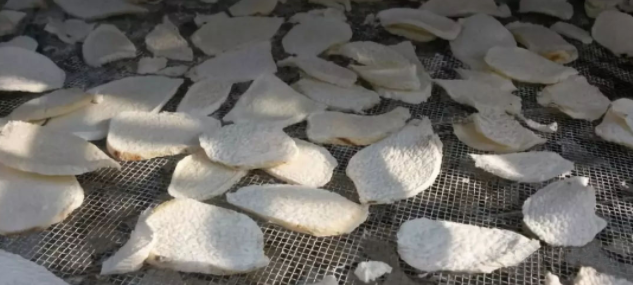 5、隨著溫度的升高,水汽的排出,淮山片的濕度越來越低,當(dāng)溫度參數(shù)設(shè)置在60-70℃時,排濕強(qiáng)度增大,直至將山藥片干燥至含水率約10%,時間需6小時左右,山藥片已烘干完成,用手掰之脆斷,外表和內(nèi)里干燥均勻。