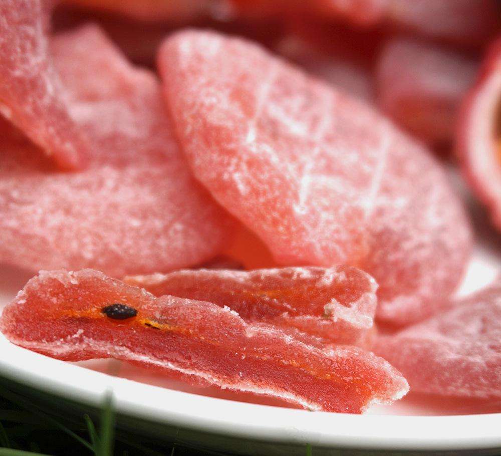 9、果漿處理:將果漿進(jìn)行解凍,然后使用白砂糖和檸檬酸或檸檬酸鈉與果漿制成調(diào)制果漿,具體的原料配比是:夏天的百香果果漿二分之一、檸檬酸少許、白砂糖二分之一左右,冬天的百香果果漿百分之四十、檸檬酸鈉百分之一、白砂糖百分之五十九;接著利用百香果皮對切之后還具有的包裹能力,將調(diào)制果漿包埋到已經(jīng)糖漬好的百香果皮中,使百香果所有的內(nèi)容又保持完整,最后依次擺放到烘篩上,并放置到熱泵烘干房中進(jìn)行烘干;
