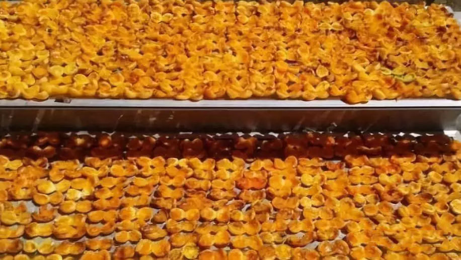 自然干制: 果實熏硫后即放置在曬場,在日光下曝曬,到5~7成干時,疊置陰干至所要求的干燥度。適度干燥的杏干,應(yīng)該是肉質(zhì)柔軟,不易折斷。用手緊握后松開,彼此不易黏著,將個別果片放在兩指間捻壓,沒有汁液滲出。