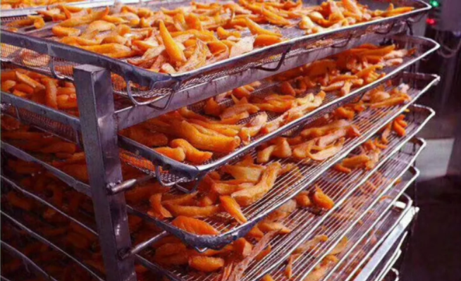 首先是前期處理工作:先將紅薯清洗干凈,然后將其放進(jìn)鍋爐中進(jìn)行蒸煮。在紅薯大約有七八成熟的時候?qū)⑵淙〕觯鹊嚼鋮s后再進(jìn)行切片。在切片環(huán)節(jié)中,首先要保持厚薄一致,基本在2公分左右將合適,完成以上步驟,就可以將紅薯片放入物料托盤里了,做到厚度均勻,擺放整齊就可以了。